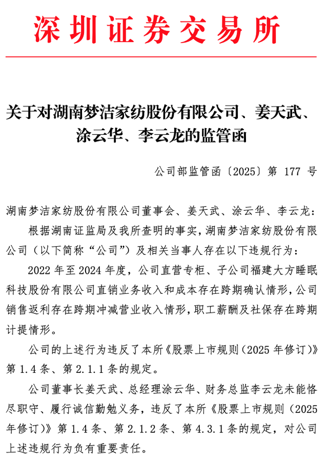而本次湖南证监局和深交所也查明,2022年至2024年度,梦洁股份直营专柜、子公司福建大方睡眠公司直销业务收入和成本存在跨期确认情形,公司销售返利存在跨期冲减营业收入情形,职工薪酬及社保存在跨期计提情形。