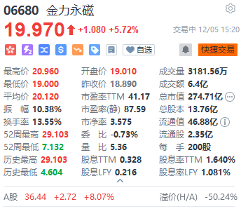 上证报中国证券网讯(记者何治民)12月5日,金力永磁午后拉升,一度涨超10%,截至15时20分,金力永磁H股股价回落至19.97港元/股,涨5.72%;A股涨8.07%,报36.44元/股。
